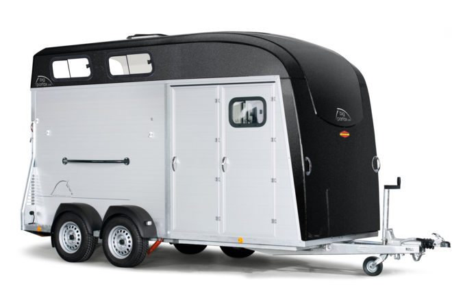 Our popular double horse trailer with the 2000kg gross weight – a stunning monoque all-polyester model with aluminium floor, rear unload with tack locker and attractive black wheels – looks good as the colour concept of all black or all silver.
