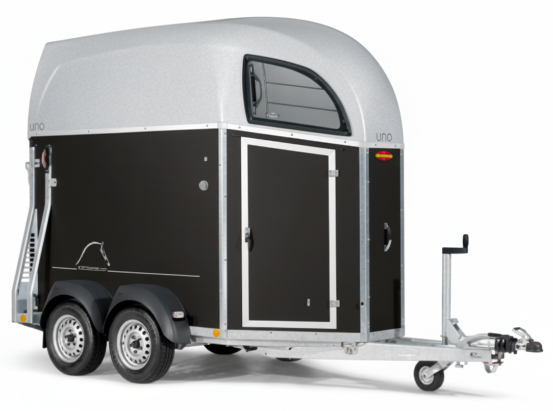 The entry level single horsebox trailer horsebox, rear unload. A classic concept of a horse trailer built with laminate side walls in either silver grey or black sides and silver or black polyester roof line. With a gross weight of 1600kg ideal for the smaller towing vehicles.