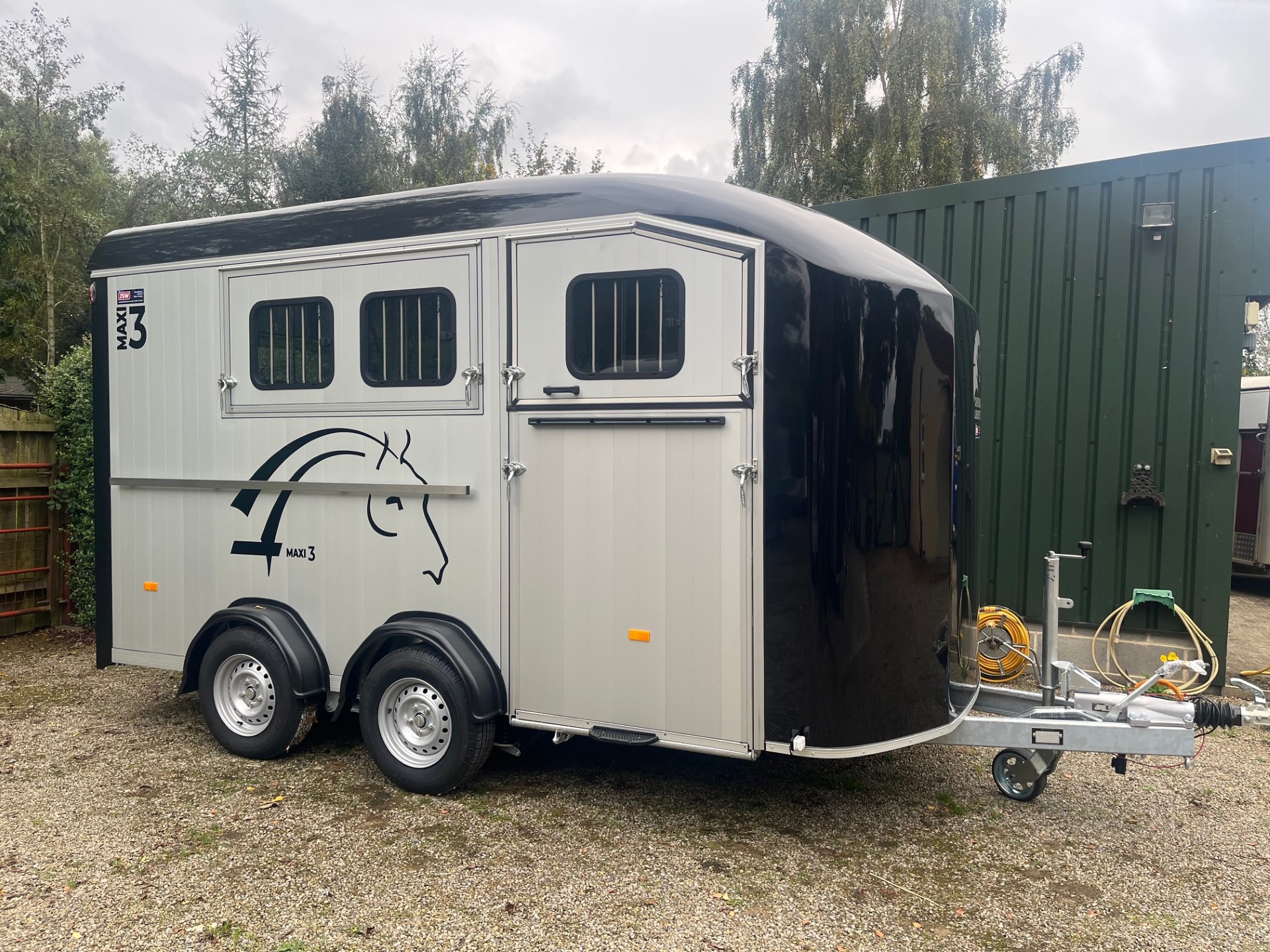 The Cheval Liberté Maxi 3 horse trailer in Black, is a popular choice for any horsey family. The Maxi 3 by Cheval Liberté in this Black glossy finish, is the ideal three stalled pony or 2 stalled horse trailer. This stunning horsebox could accommodate all your tack and equipment with its own walk-in tack compartment to the off-side. Inside you will find three generous saddle brackets and bridle hooks, interior lamp, wheel-chocks and you spare wheel are all house here.
