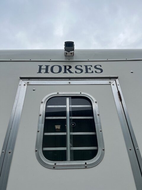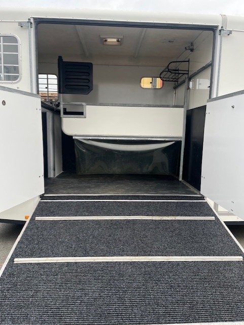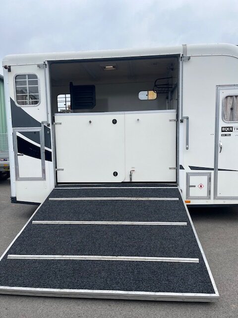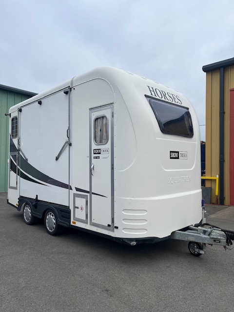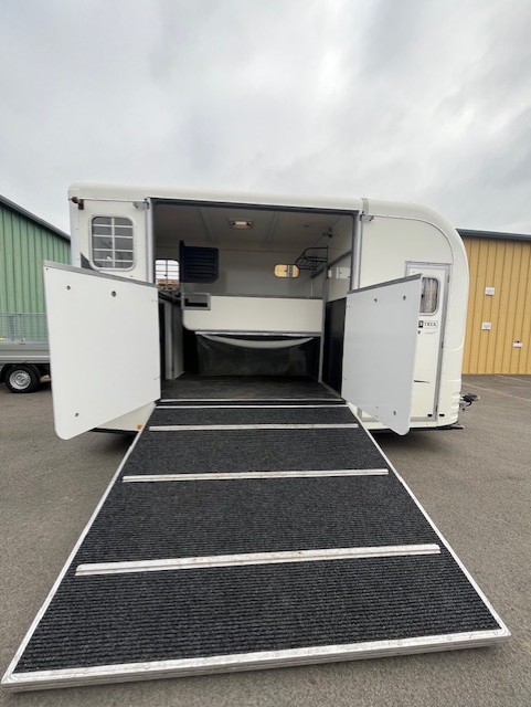• This side unloading, rear facing horsebox trailer with rear grooms door access and toe step.