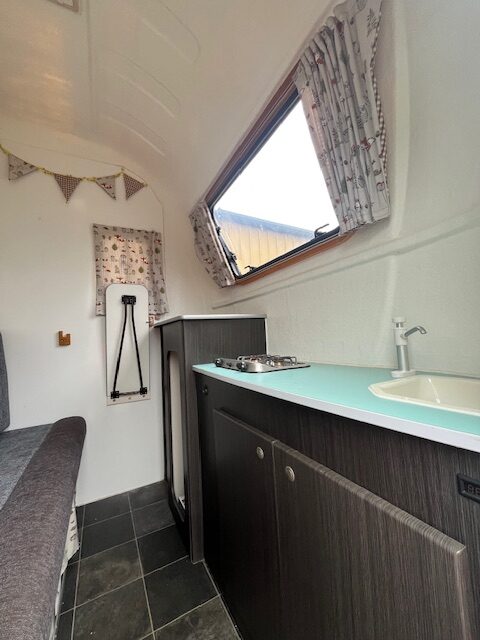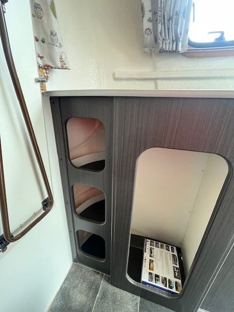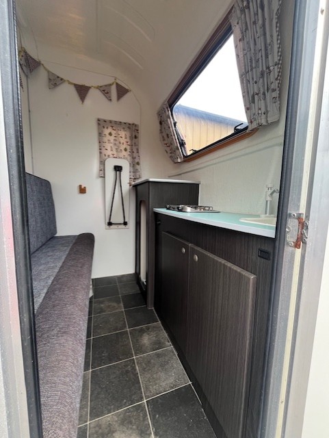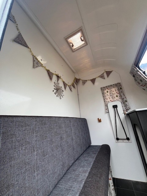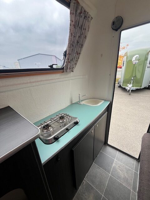 • Front living suit with sliding window in jockey door, bench seating which transitions into bunk bed and has storage underneath the base unit with curtains.  Interior light.  Compact sink and with twin gas hob, large front window, fitted matching curtains, 12V socket and mirror.